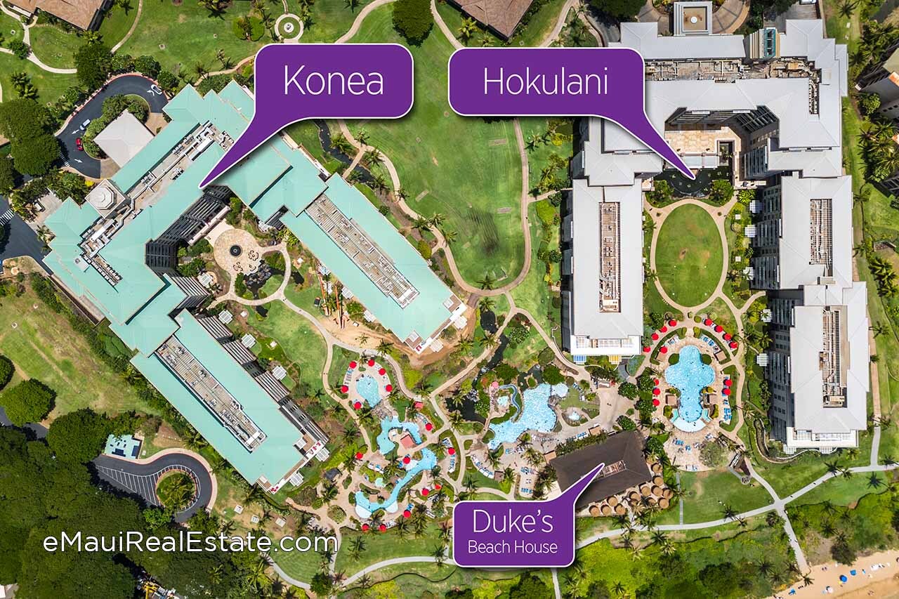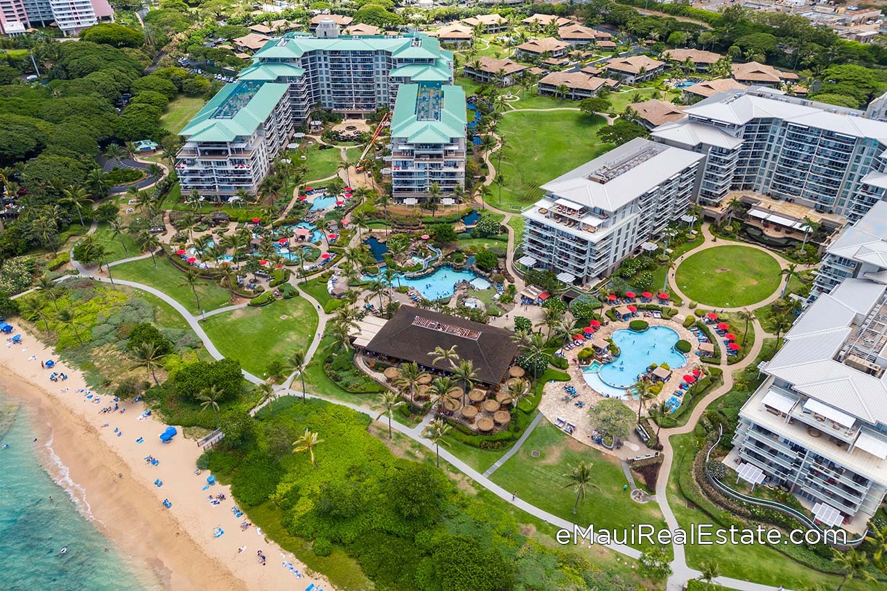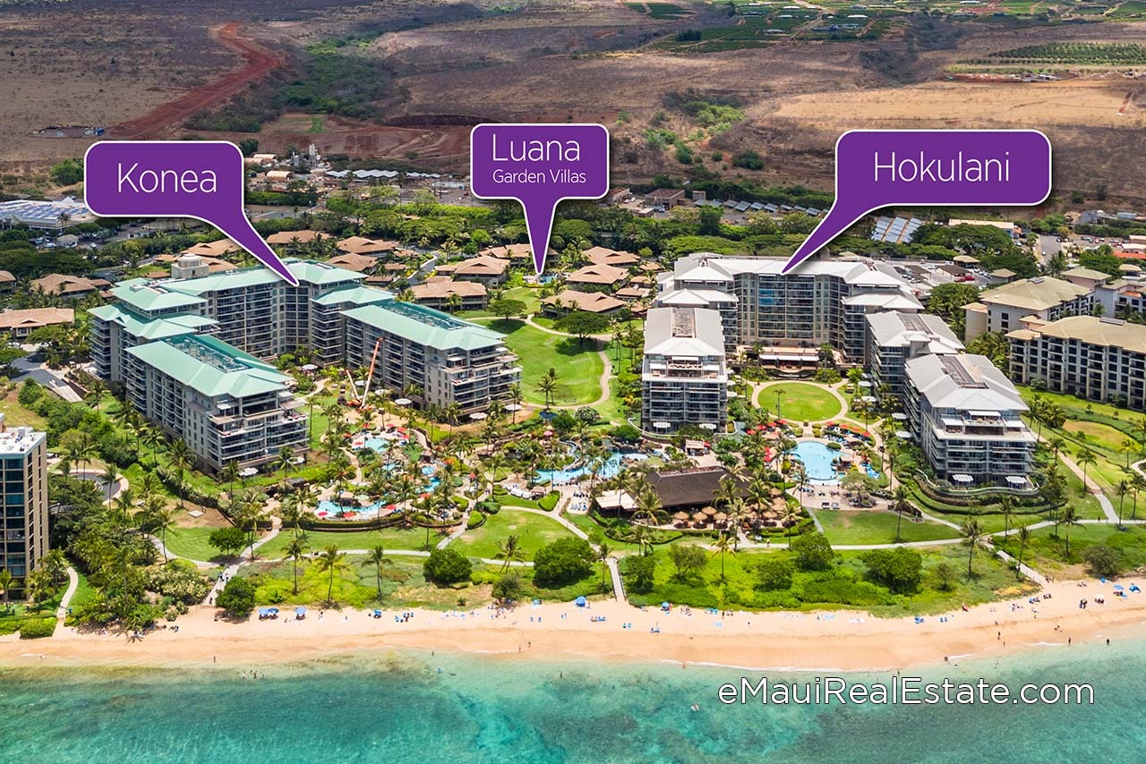 Aerial showing Luana Garden Villas in context with the other Honua Kai buildings of Hokuilani and Konea