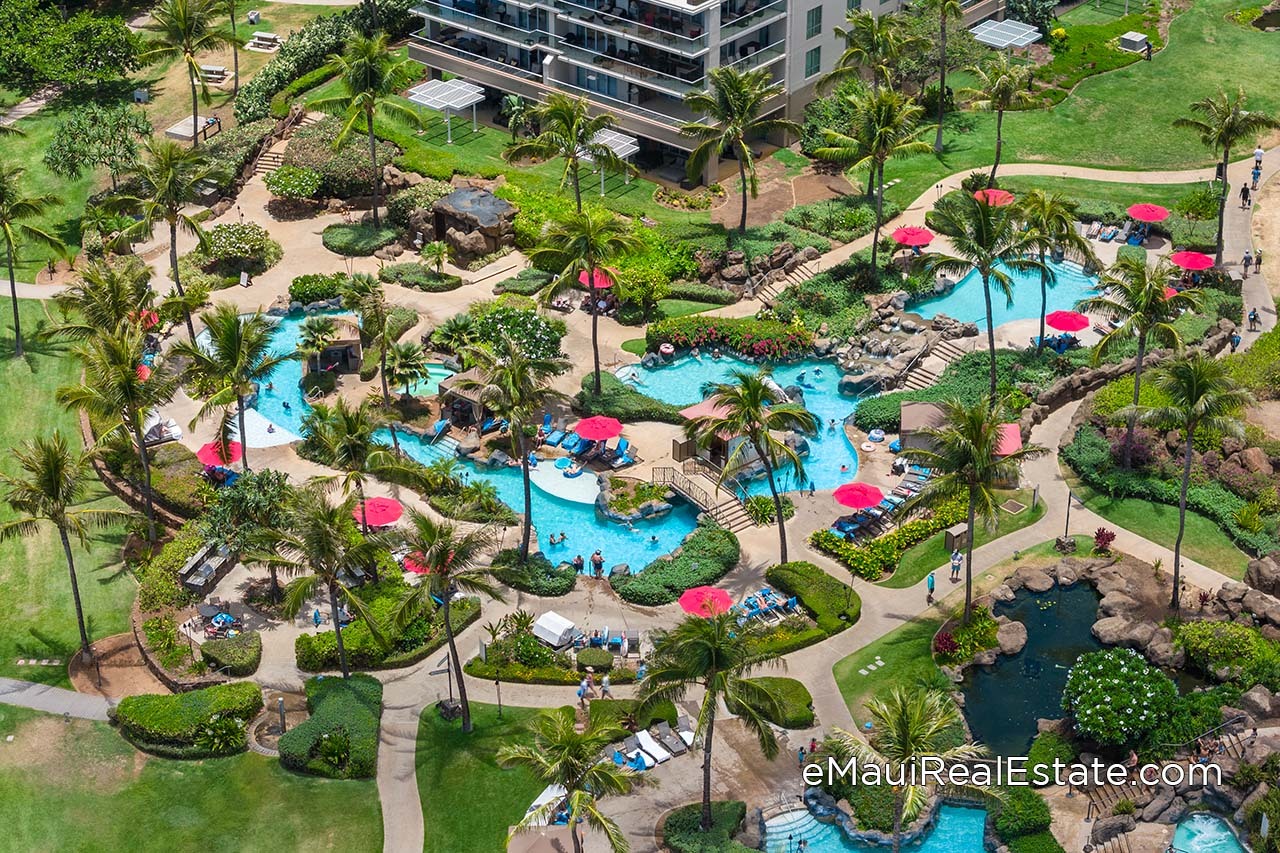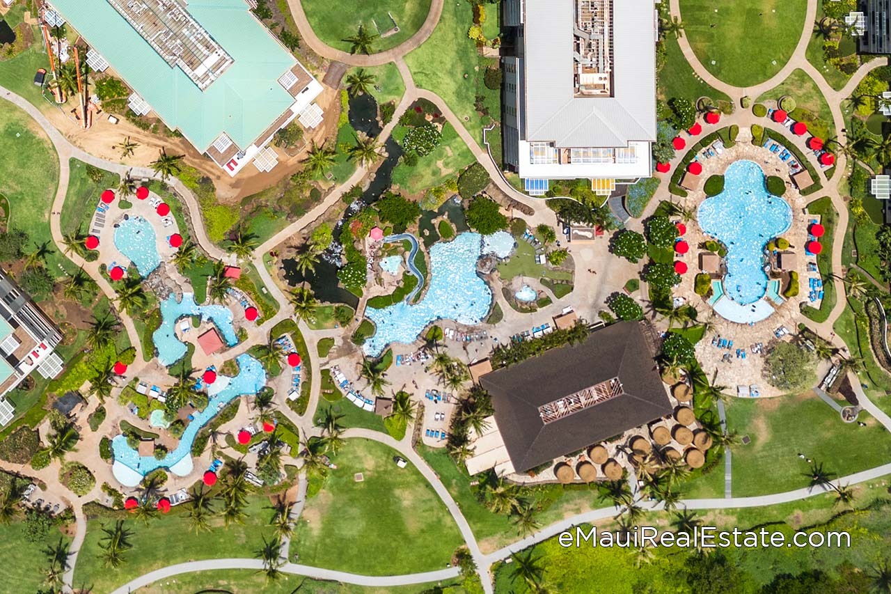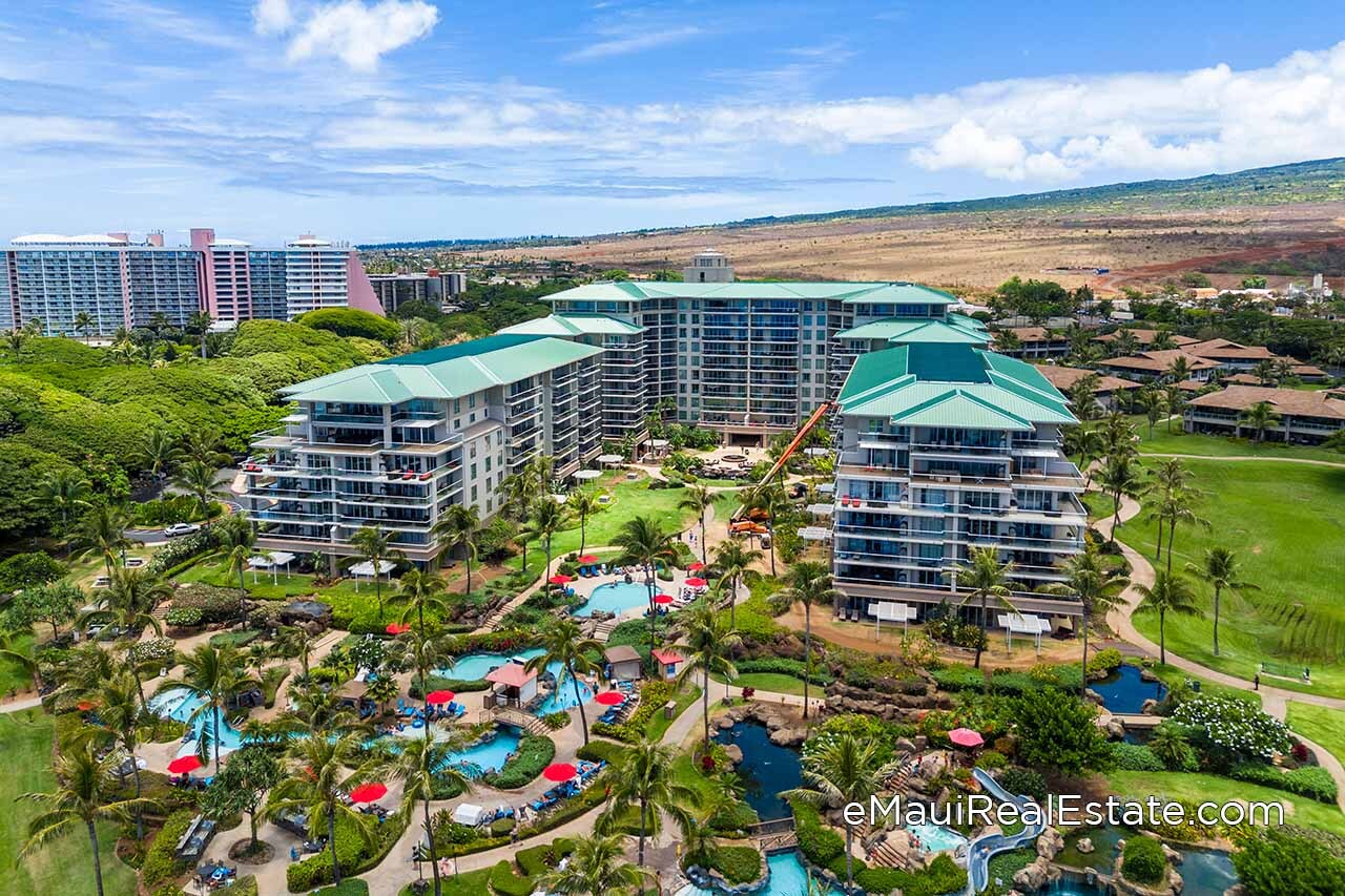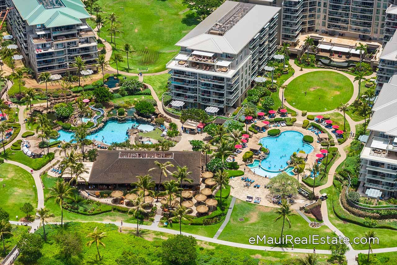 Aerial showing Luana Garden Villas in context with the other Honua Kai buildings of Hokuilani and Konea