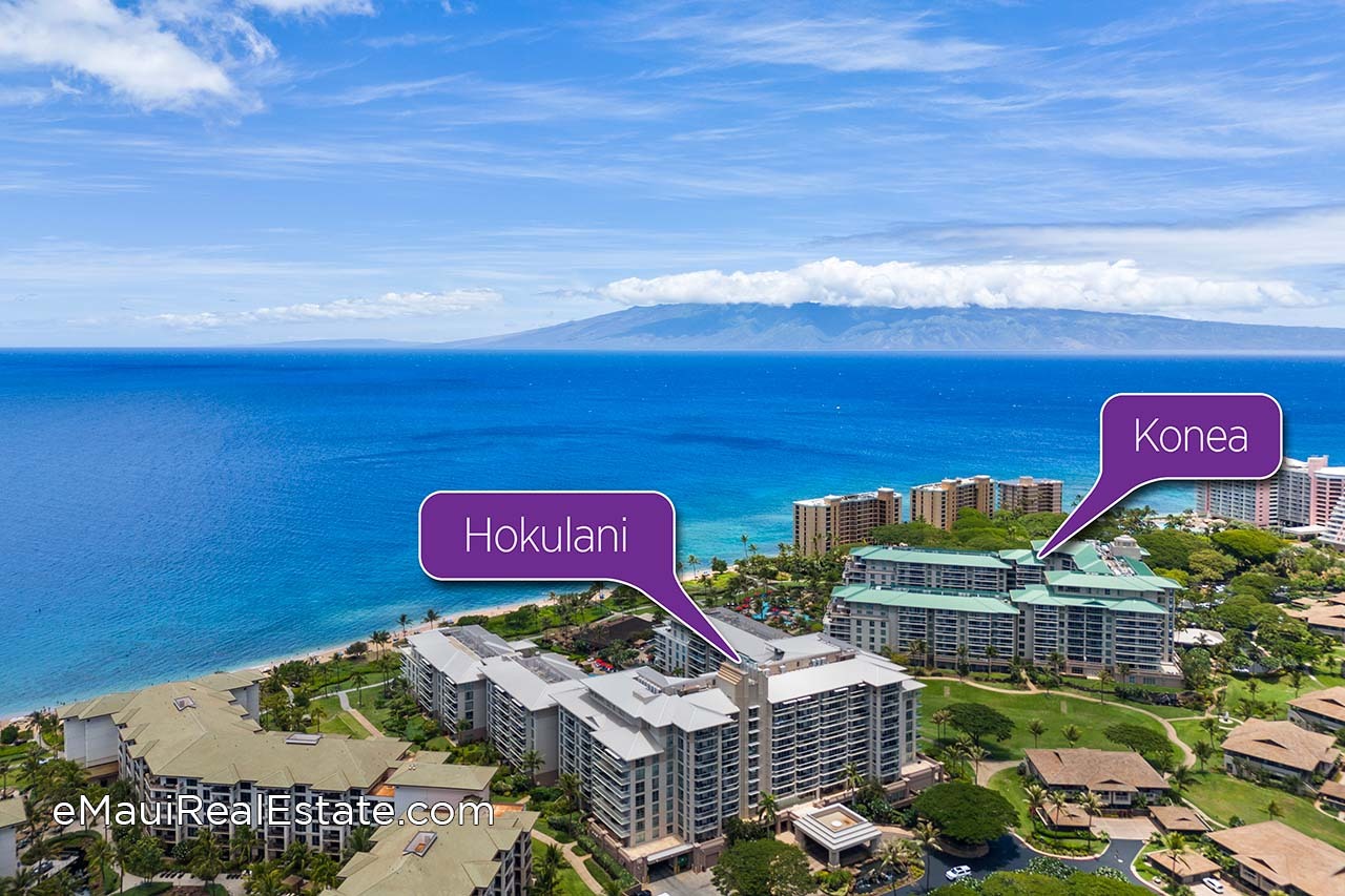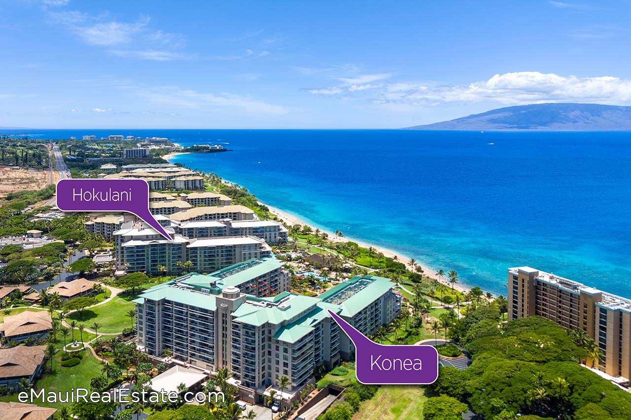 The Hokulani and Konea buildings at Honua Kai both front the world famous Kaanapali Beach